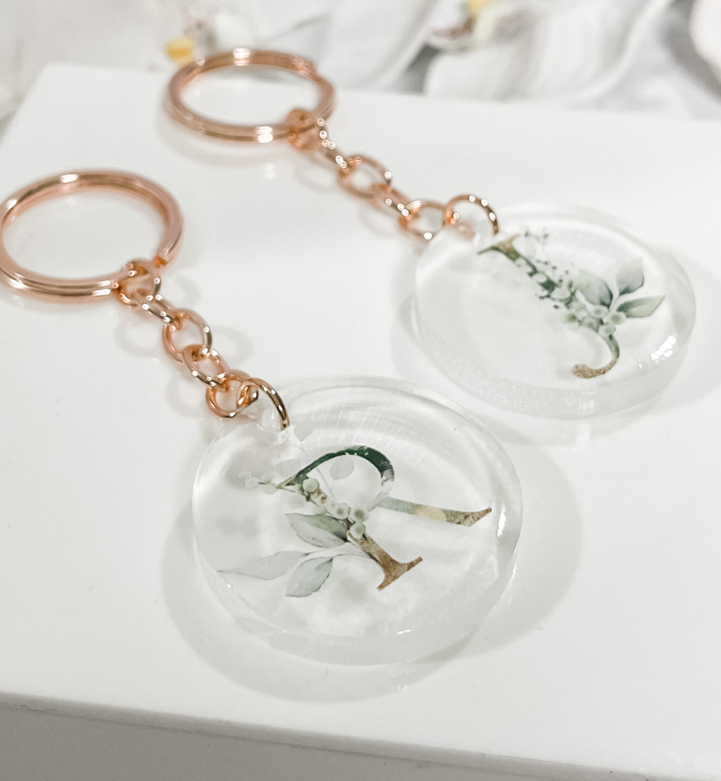 The soft botanic florals and initial are custom UV printed on a 6mm clear frost acrylic and matched with a gorgeous rosegold plated keychain. The clear acrylic is laser cut giving it a smooth polished finish.